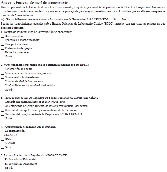Para la evaluación del nivel de conocimiento sobre BPLC fue aplicada una encuesta (Anexo 1), diseñada por este grupo, avalada por un comité de expertos del Comité Académico de la Maestría en Gestión de Calidad y Medio Ambiente de la Universidad de La Habana.