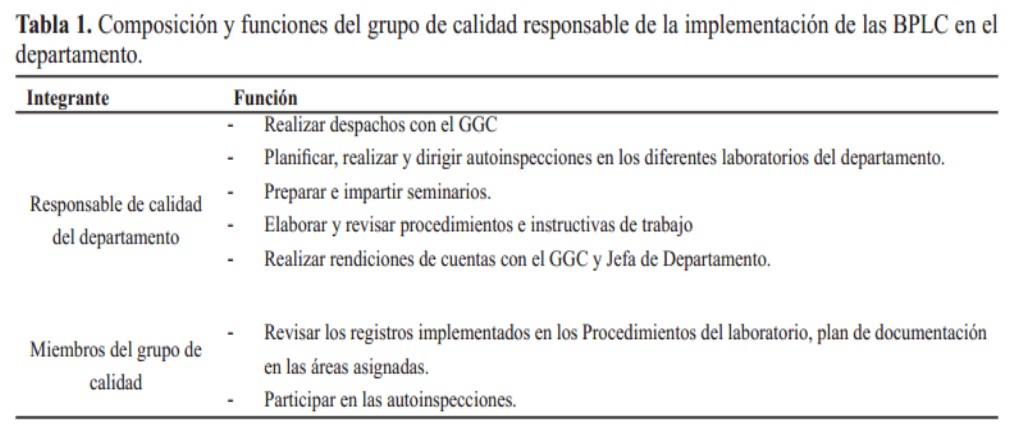 La conformación del grupo de calidad del departamento se basó en la elección de personal representante de cada área, permitiendo diseñar un sistema en conjunto a la medida de cada rutina de trabajo de los diferentes laboratorios, teniendo en cuenta sus especificaciones. La dirección del departamento nombró un responsable de calidad, quien desplegó esta actividad en el área (Tabla 1).